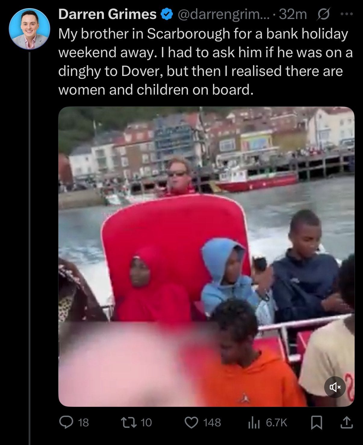 My brother in Scarborough for a bank holiday weekend away. I had to ask him if he was on a dinghy to Dover, but then I realised there are women and children on board.