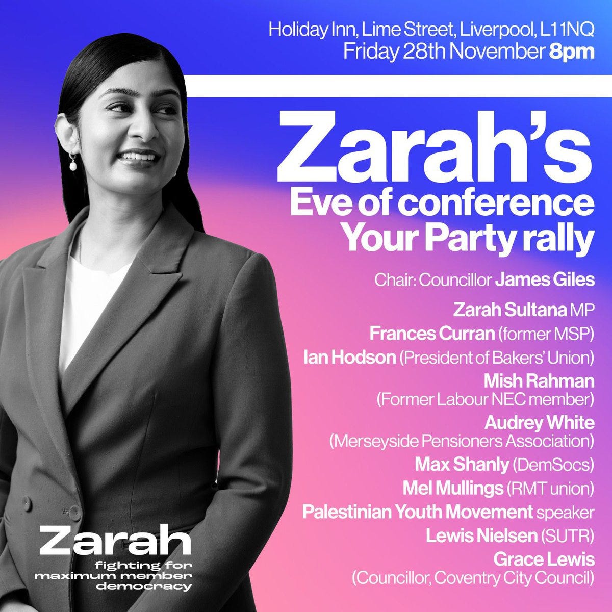 They’re in Liverpool for the inaugural conference of Your Party and Eleanor is just back from a rally addressed by one of the two leading figures in the zygotic party, Zarah Sultana, MP for Coventry South. Eleanor is impressed by the number of different left paper sellers selling left papers to each other. She and Vincent like the cut of Sultana’s anti-Zionist, anti-Nato, pro working-class jib, but doubt whether she has the revolutionary cojones to really take on the right-wing, witch-hunting, er, Jeremy Corbyn.